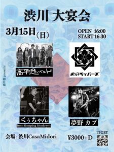 - 2026年3月15日(日)「渋川大宴会」 at渋川CasaMidori 【出演】高平悠バンド東京ペッパーズ夢野カブくぅちゃん (from Romping Monkeye’s) OPEN 16:00 START 16:30Charge […]
