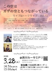 - 2026年3月28日(土)【この空はガザの空ともつながっている】 ライブ&トークライブVol.10@渋川Casa Midoriトークライブ: 藤原亮司(ジャーナリスト,ジャパンプレス所属)弾き語り: にたないけん Open14:30/St […]