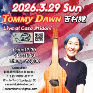 - 2026年3月29日(日)【Tommy Dawn(吉村瞳) Live @ Casa Midori 】 Open17:30/Start18:00Charge ¥3,000