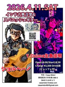 - 2026年4月11日(土)【インド古典音楽とスパニッシュギター】出演✴Y.Ozima生島佳明/ショルへーノOpen18:00/Start18:30Charge ¥3,500 Drink別(ビュッフェ付)