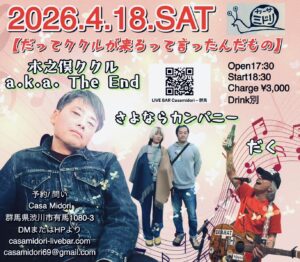 - 2026年4月18日(土)【だってククルが来るって言ったんだもの】 出演 ✴木之俣ククル a.k.a. The End(vo.gt)✴さよならカンパニー(えくみvo.gt/さとにぃgt.)✴だく(vo.gt) Open17:30/Start18: […]