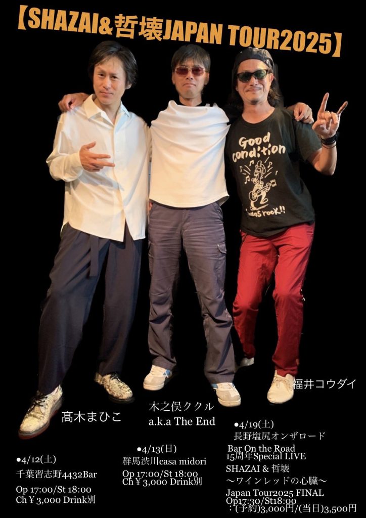 2025年4月6日 / 最終更新日時 : 2025年4月6日 casamidori LIVE 2025年4月13日(日) SHAZAI&哲壊JAPAN TOUR2025 髙木まひこ/ 福井コウダイ / 木之俣ククル a.k.a The End