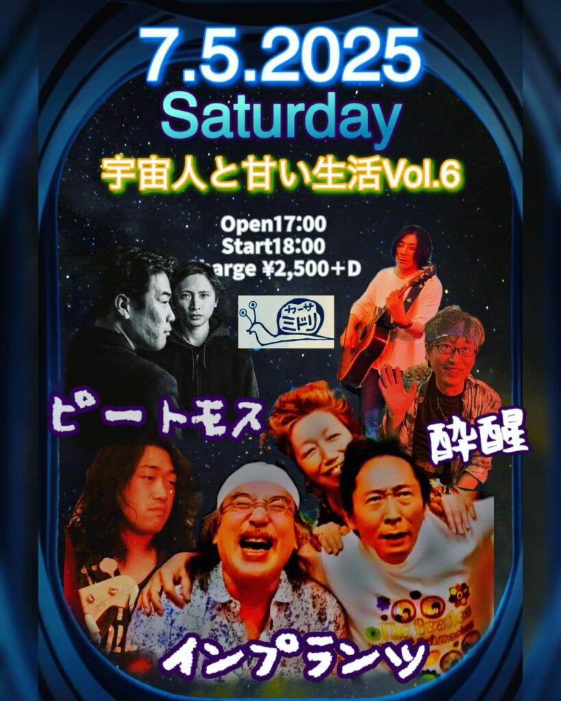 2025年7月17日 / 最終更新日時 : 2025年7月17日 casamidori LIVE 2025年7月5日(土) 宇宙人と甘い生活vol.6出演/インプランツ/ピートモス/酔醒Open17:00/Start18:00Charge ¥2,500 D別