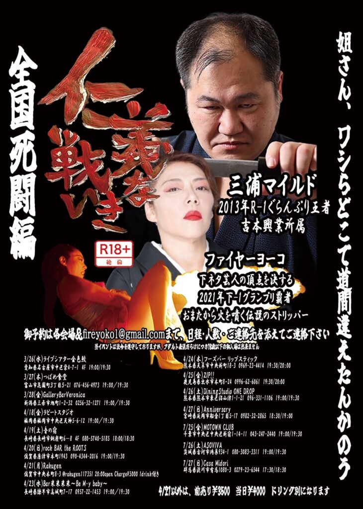 2025年7月17日 / 最終更新日時 : 2025年7月17日 casamidori LIVE 2025年7月27日(日) 【仁義なき戦い、全国死闘編】 出演☆ファイヤーヨーコ/三浦マイルド Open17:30/Start18:30 前売(予約)¥3,500/当日¥4,000 D別