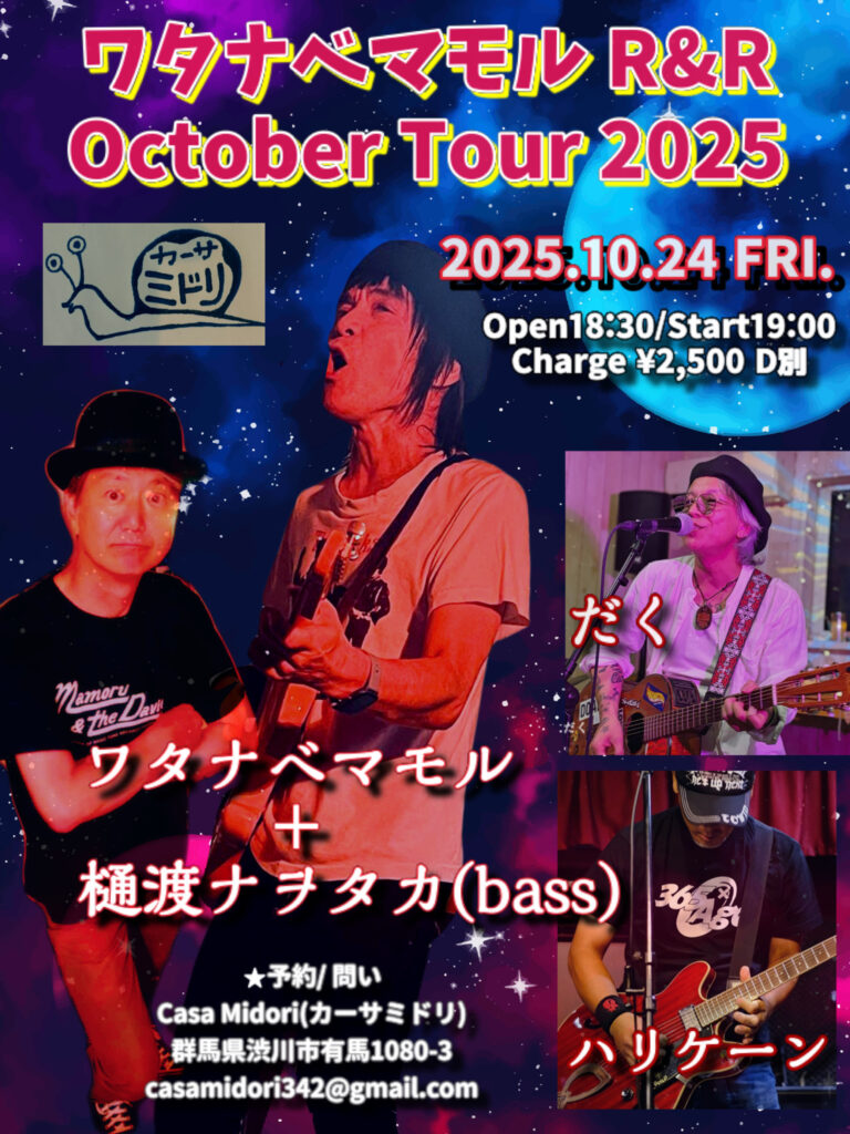 2025年10月1日 / 最終更新日時 : 2025年10月1日 カーサミドリ LIVE 2025年10月24日(金) 【ワタナベマモル R&R October Tour 2025】ワタナベマモル+樋渡ナヲタカ(Bass)だく/ハリケーンOpen18:30/Start19:00Charge ¥2,500 Drink別
