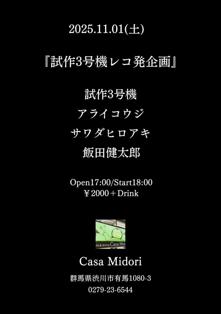2025年10月30日 / 最終更新日時 : 2025年10月30日 カーサミドリ LIVE 2025年11月1日(土) 【試作3号機レコ発企画】 出演☆ 試作3号機🔹アライコウジ🔹サワダヒロアキ🔹飯田健太郎 Open17:00/Start18:00Charge ¥2,000 ➕Drink