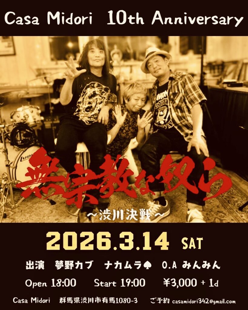 2026年2月18日 / 最終更新日時 : 2026年2月18日 カーサミドリ LIVE 2026年3月14日(土) 【無宗教な奴ら〜渋川決戦】 出演✴夢野カブ/ナカムラ♠O.A みんみん Open18:00/Start19:00Charge¥3,000 Drink別