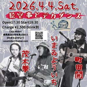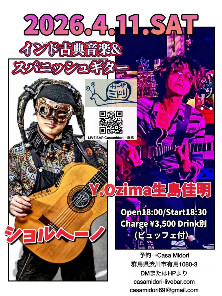 2026年4月8日 / 最終更新日時 : 2026年4月8日 カーサミドリ LIVE 2026年4月11日(土) 【インド古典音楽とスパニッシュギター】出演✴Y.Ozima生島佳明/ショルへーノOpen18:00/Start18:30Charge ¥3,500 Drink別(ビュッフェ付)