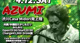2025年4月6日 / 最終更新日時 : 2025年4月6日 casamidori LIVE 2025年4月12日(土) AZUMI 渋川Casa Midori発上陸 出演☆AZUMI 中澤田たかし&エリ みんみん Open 19:00/Start 20:00 Charge¥3,000 Drink別